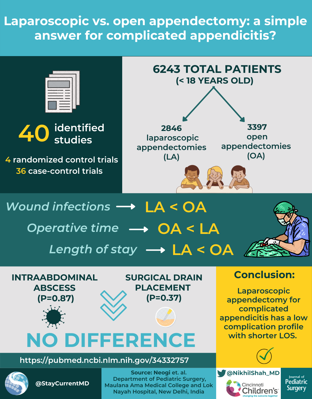 Conclusion: This meta-analysis objectively demonstrates that laparoscopy has a better overall complication profile compared to OA and should be the procedure of choice in children with complicated appendicitis.